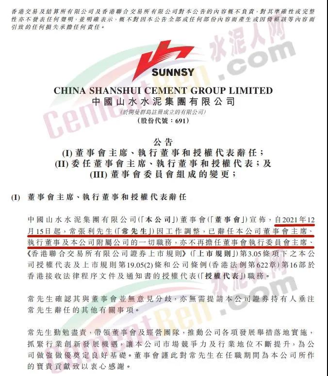 山水水泥12月16日早間在港交所公告,自2021年12月15日起,常張利因工作調(diào)整,已辭任公司董事會主席、執(zhí)行董事及公司附屬公司的一切職務(wù),亦不再擔(dān)任董事會執(zhí)行委員會主席、《香港聯(lián)合交易所有限公司證券上市規(guī)則》第3.05條項下的公司授權(quán)代表及上市規(guī)則第19.05(2)條和公司條例(香港法例第622章)第16部于中國香港接收法律程序文件及通知書的授權(quán)代表職務(wù)。