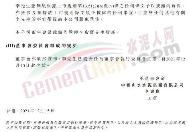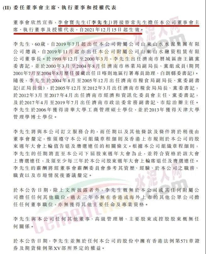 公告簡歷顯示,李會寶,60歲,自2019年7月起出任公司附屬公司山東山水水泥集團有限公司總裁,自2019年11月起亦出任公司附屬公司山東山水融資租賃有限公司董事長。此前于2017年4月至2019年7月出任濟南市政法委常務(wù)副書記、市綜治辦主任。