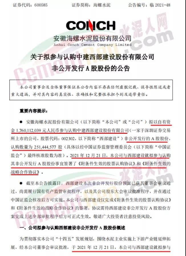 海螺水泥公告稱,為貫徹落實本公司“十四五”發(fā)展規(guī)劃,圍繞水泥主業(yè)實施上下游產(chǎn)業(yè)鏈延伸拓展,經(jīng)本公司董事會審議批準(zhǔn),于2021年12月21日,本公司與西部建設(shè)就擬參與認(rèn)購其非公開發(fā)行股份事宜簽署了《附條件生效的股票認(rèn)購協(xié)議》和《附條件生效的戰(zhàn)略合作協(xié)議》。西部建設(shè)是國內(nèi)領(lǐng)先的建材產(chǎn)業(yè)綜合服務(wù)商,也是國內(nèi)商品混凝土行業(yè)的領(lǐng)軍企業(yè),本公司擬通過認(rèn)購其非公開發(fā)行A股股份的方式,進一步加強雙方在原材料供銷、混凝土業(yè)務(wù)、砂石骨料業(yè)務(wù)、物流運輸、產(chǎn)業(yè)互聯(lián)網(wǎng)等方面的戰(zhàn)略合作。