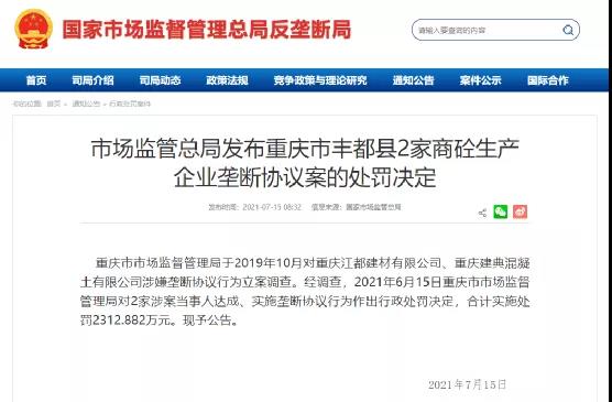 7月15日市場(chǎng)監(jiān)管總局就發(fā)布重慶市豐都縣2家商砼生產(chǎn)企業(yè)壟斷協(xié)議案的處罰決定,合計(jì)實(shí)施處罰2312.882萬(wàn)元。
