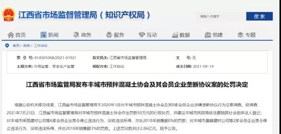 日前,江西省市場(chǎng)監(jiān)管局對(duì)豐城市預(yù)拌混凝土協(xié)會(huì)及其8家會(huì)員企業(yè)涉嫌壟斷協(xié)議進(jìn)行處罰,罰沒(méi)款共計(jì)2.86億元。