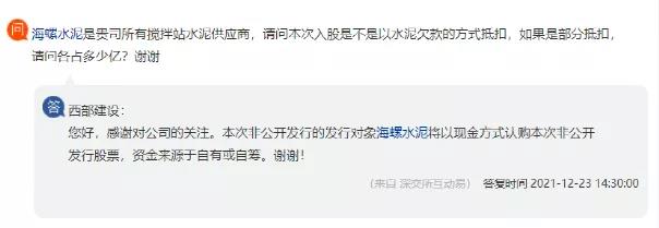 西部建設(shè)回復稱,本次非公開發(fā)行的發(fā)行對象海螺水泥將以現(xiàn)金方式認購本次非公開發(fā)行股票,資金來源于自有或自籌。