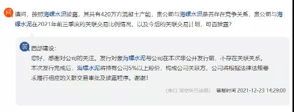 西部建設(shè)回復稱,海螺水泥與公司在本次非公開發(fā)行前,不存在關(guān)聯(lián)關(guān)系。本次發(fā)行完成后,海螺水泥將持有公司5%以上股份,構(gòu)成公司關(guān)聯(lián)方。