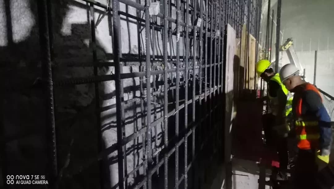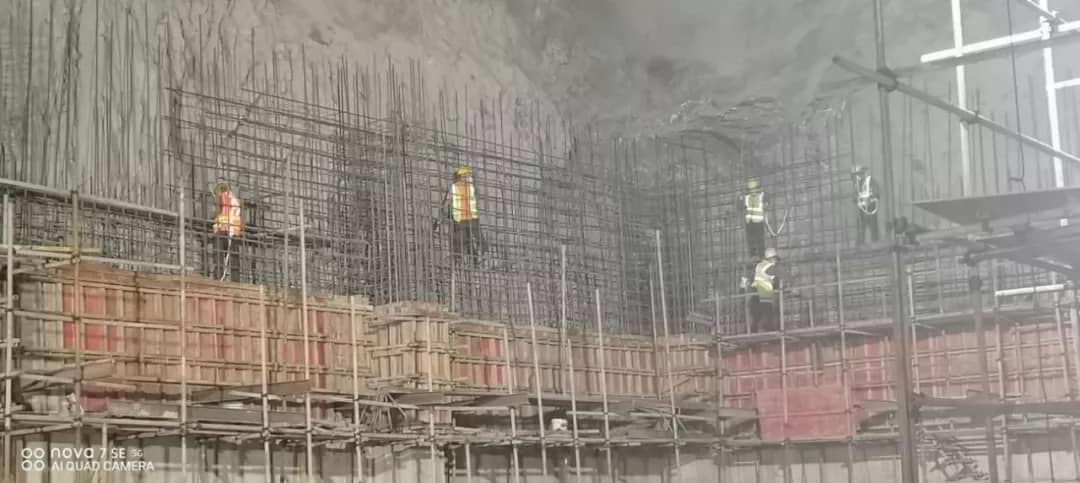 1#、2#破碎硐室是整個(gè)開拓系統(tǒng)工程的“咽喉”,上連主礦倉(cāng),下連皮帶輸送平硐,其施工質(zhì)量和進(jìn)度對(duì)整個(gè)開拓系統(tǒng)工程至關(guān)重要。破碎硐室圍巖性質(zhì)較差,且斷面大,高度高,凈高度達(dá)25米,對(duì)硐室開挖和支護(hù)帶來很大困難;破碎硐室后期腳手架搭設(shè)量大,鋼筋制作、綁扎量大,模板工程量大,混凝土澆筑量大,結(jié)構(gòu)復(fù)雜,且作業(yè)空間受限,給土建施工帶來極大的挑戰(zhàn)。對(duì)于1#、2#破碎硐室的施工,為保證安全、質(zhì)量和進(jìn)度,項(xiàng)目部多次組織圖紙會(huì)審,認(rèn)真分析每個(gè)施工環(huán)節(jié),在施工過程中合理安排施工順序,加強(qiáng)組織協(xié)調(diào),增開措施巷道,有效地保證了破碎硐室的順利施工。