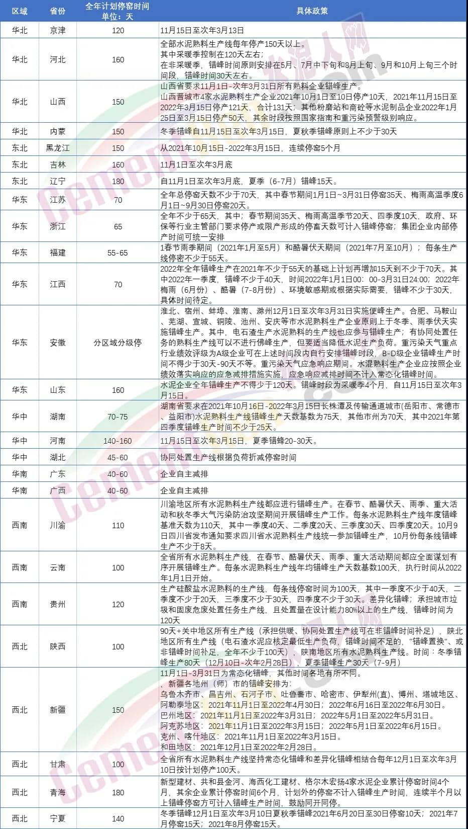應(yīng)工信部、生態(tài)環(huán)境部兩部委關(guān)于進(jìn)一步做好水泥常態(tài)化錯(cuò)峰生產(chǎn)的通知要求,絕大部分省份都提前發(fā)布了2022年全年錯(cuò)峰生產(chǎn)計(jì)劃,全年停產(chǎn)基準(zhǔn)天數(shù)最長達(dá)到180天。