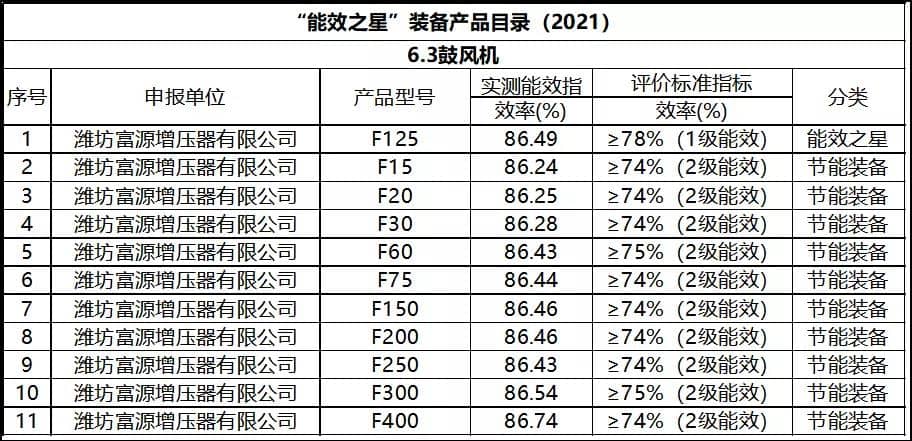 日前,工信部公示了《國家工業(yè)節(jié)能裝備及“能效之星”裝備產品目錄(2021)》,其中,濰坊富源增壓器有限公司(以下簡稱“濰坊富源”)申報的具有自主知識產權的12款型號空氣懸浮鼓風機全部入圍,數量位居行業(yè)首位。