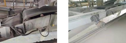 4.1對皮帶輸送機架進行了改善:原來進料平皮帶與出料斜皮帶兩行走輪間距過大,斜皮帶機頭部又安裝了懸掛式袋裝移動小車升降機構,在裝車過程中出現(xiàn)平、斜皮帶機滾筒聯(lián)接處斷裂故障三次。通過現(xiàn)場裝車時觀察及與智能公司的溝通,在兩皮帶聯(lián)接處增設一組行走平輪(見圖4),增加平、斜皮帶間的支撐力,避免機架聯(lián)接處開裂,造成停機故障。