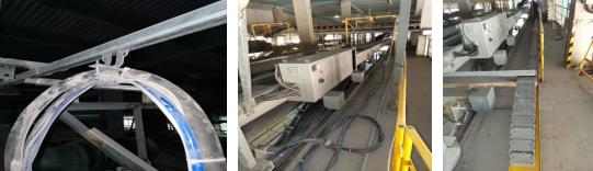 4.2對裝車機移動電源線進行了改善:由于原來設計失誤,電源線采用吊掛移動式,在小車頻繁的移動過程中,發(fā)生掛鉤脫落故障,由于崗位人員沒有及時發(fā)現(xiàn),造成小車移動時對電源線,氣管、信號線壓斷,造成停機故障。采用托鏈式替代吊掛式移動小車主電源(見圖5)。