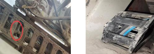 4.5 2#智能裝車機運行到6個月后,出現(xiàn)機頭內小車放料翻板運行過程中不放料,安排維護人員進行了排查,是電磁閥的電源線纜不通造成,更換了損壞的電源線纜,恢復正常生產。在隨后頻繁出現(xiàn)類似故障,更換在線線纜后恢復正常,一周后又出現(xiàn)翻板打不開故障。通過對故障的分析,在線電纜不適合頻繁移動,造成故障停機,將原RVV型號的信號線纜更換為TRVV信號線纜,徹底解決了這一故障(見圖8)。