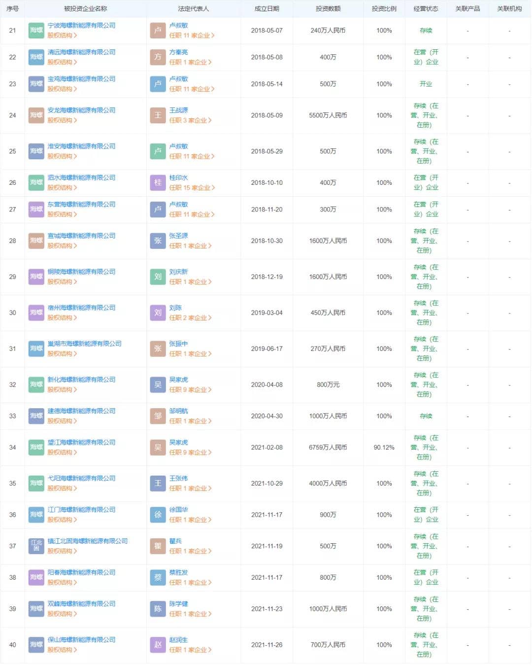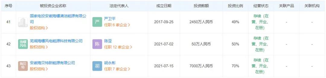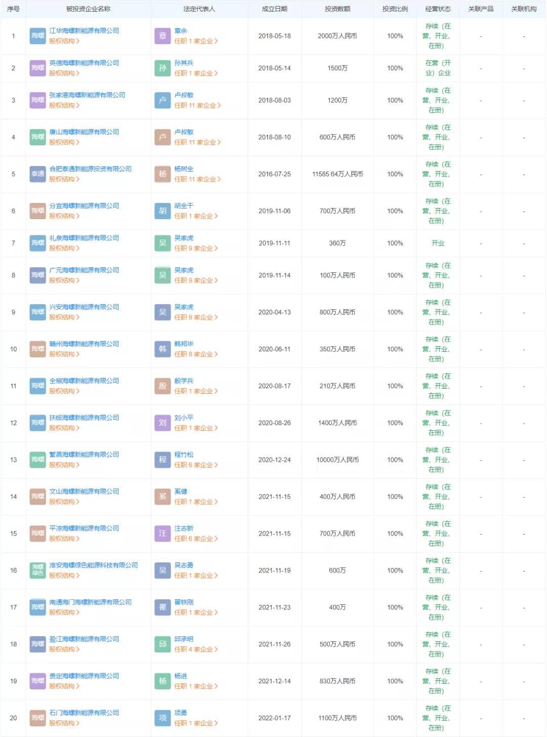 天眼查查詢結(jié)果顯示,安徽海螺新能源有限公司成立于2018年,法定代表人為李曉波,經(jīng)營(yíng)范圍包含光伏發(fā)電、風(fēng)力發(fā)電、儲(chǔ)能系統(tǒng)領(lǐng)域內(nèi)的技術(shù)開(kāi)發(fā)等,由海螺水泥100%控股,對(duì)外投資了包含江華海螺新能源有限公司、英德海螺新能源有限公司、張家港海螺新能源有限公司在內(nèi)的43家企業(yè)。具體如下: