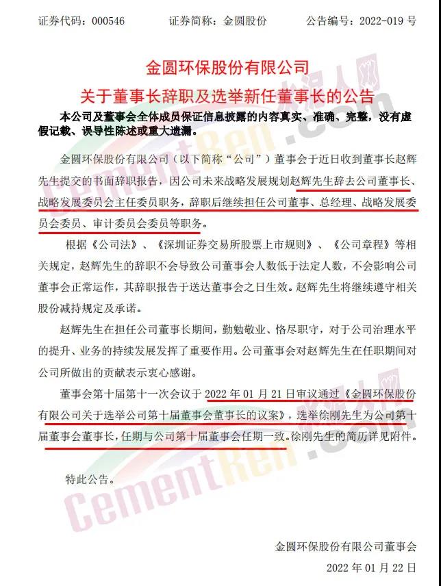 1月21日晚間,金圓股份(000546)披露公告稱,公司董事會于近日收到董事長趙輝提交的書面辭職報告,因公司未來戰(zhàn)略發(fā)展規(guī)劃,趙輝辭去公司董事長、戰(zhàn)略發(fā)展委員會主任委員職務,辭職后繼續(xù)擔任公司董事、總經理、戰(zhàn)略發(fā)展委員會委員、審計委員會委員等職務。
