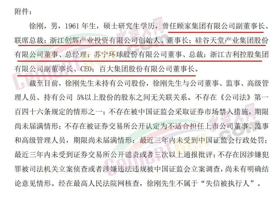 新任董事長徐剛簡歷顯示,其曾任顧家集團有限公司副董事長、聯席總裁;浙江創(chuàng)輝產業(yè)投資有限公司創(chuàng)始人、董事長;硅谷天堂產業(yè)集團股份有限公司董事、總經理;蘇寧環(huán)球股份有限公司董事、總裁;浙江吉利控股集團有限公司副董事長、CEO;百大集團股份有限公司董事長。