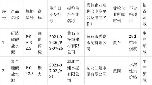 近日,湖北省市場監(jiān)管局通報134種工業(yè)產(chǎn)品質(zhì)量監(jiān)督抽查結(jié)果。其中,抽查了63家企業(yè)生產(chǎn)的120批次水泥,檢測發(fā)現(xiàn)不合格產(chǎn)品2批次,不合格項目為28d抗壓強(qiáng)度、水溶性六價鉻。