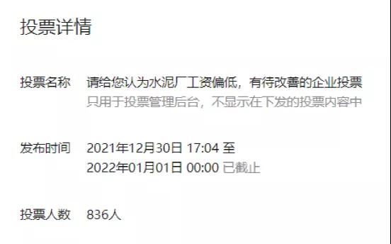 2021年最后一天,水泥人網(wǎng)發(fā)起了全網(wǎng)民調(diào),結(jié)果顯示有15%的網(wǎng)友投票海螺水泥,認(rèn)為企業(yè)工資偏低,有待改善。