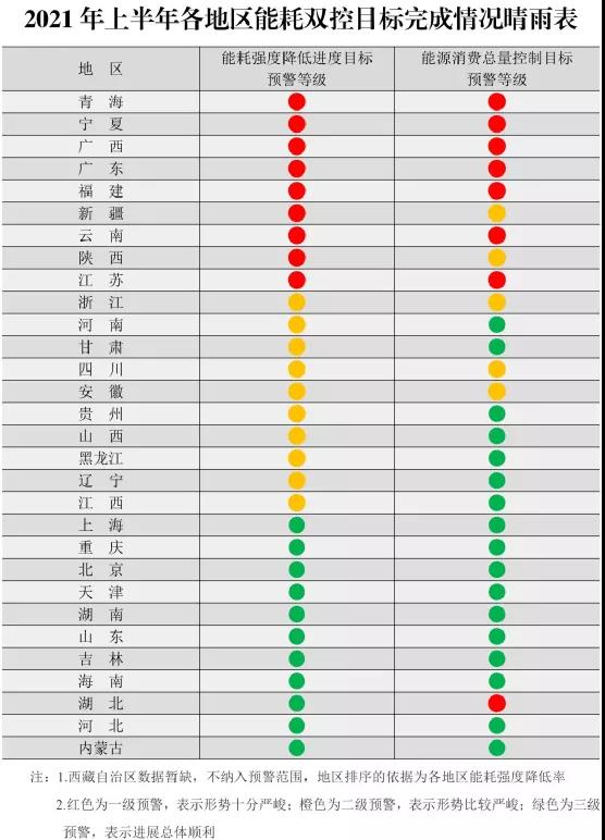 國家發(fā)展改革委印發(fā)《2021年上半年各地區(qū)能耗雙控目標(biāo)完成情況晴雨表》。青海、寧夏、廣西、廣東、福建、新疆、云南、陜西、江蘇、浙江、安徽、四川等12個地區(qū)在能耗降低和能源消費總量方面均呈現(xiàn)嚴(yán)峻態(tài)勢。全國有一半以上的省份,上半年“雙控”目標(biāo)都沒完成,多區(qū)域采取最嚴(yán)格的限產(chǎn)、限電措施。