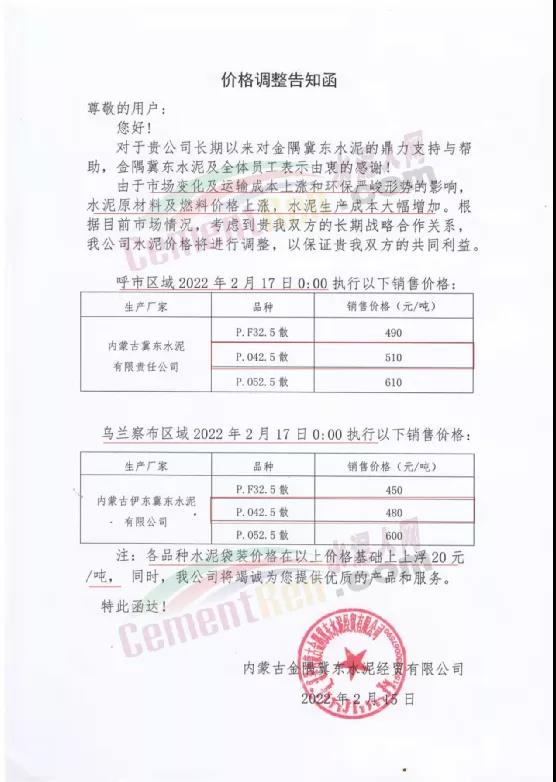 日前,內(nèi)蒙古金隅冀東水泥經(jīng)貿(mào)有限公司發(fā)布《價格調(diào)整告知函》稱,由于市場變化及運輸成本上漲和環(huán)保嚴峻形勢的影響,水泥原材料及燃料價格上漲,水泥生產(chǎn)成本大幅增加。根據(jù)目前市場情況,上調(diào)公司水泥價格。呼市區(qū)域自2月17日0時起執(zhí)行P.F32.5散490元/噸,P.O42.5散510元/噸,P.O52.5散610元/噸;