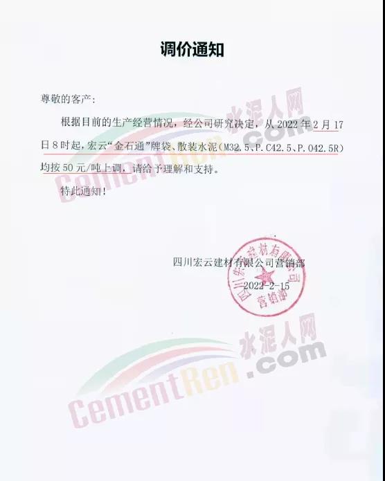 四川宏云建材有限公司營銷部通知,根據(jù)目前的生產(chǎn)經(jīng)營情況,經(jīng)公司研究決定,從2022年2月17日8時起,宏云“金石通”牌袋、散裝水泥(M32.5、P.C42.5、P.O42.5R)均按50元/噸上調(diào)。