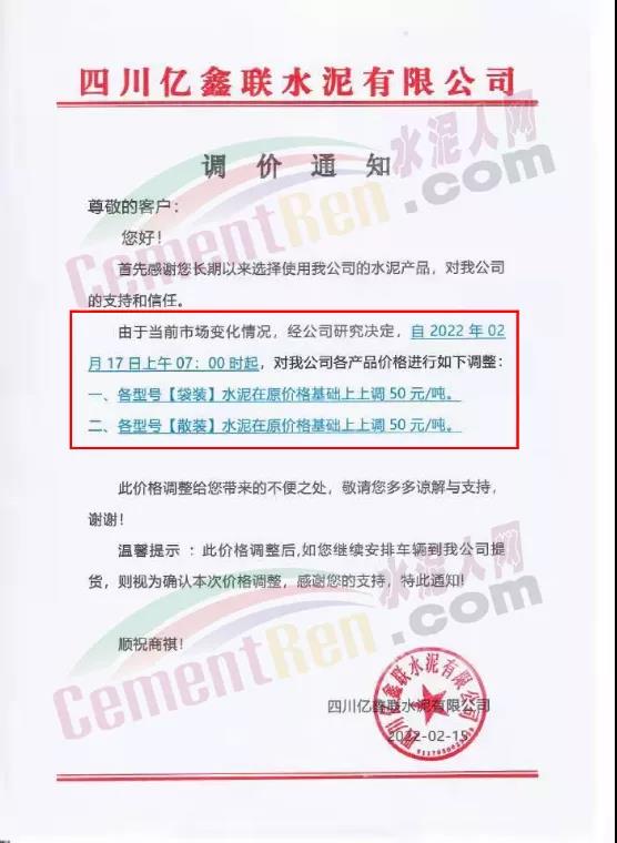 四川億鑫聯(lián)水泥有限公司通知,由于當前市場變化情況,經(jīng)公司研究決定,自2022年2月17日上午7時起,對公司各產(chǎn)品價格進行調(diào)整。各型號水泥在原價格基礎上上調(diào)50元/噸。