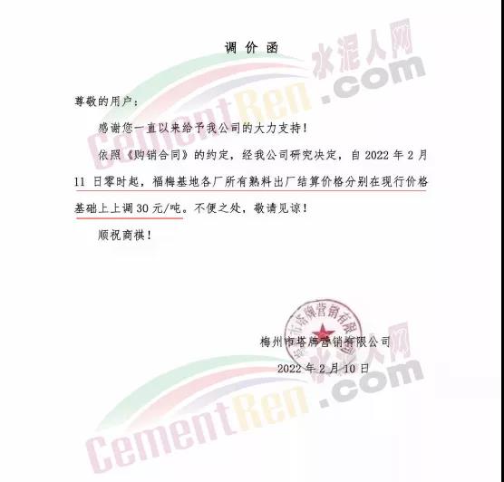 廣東梅州塔牌水泥通知自2022年2月16日零時起,福梅基地各廠所有熟料出廠結算價格分別在現(xiàn)行價格基礎上上調(diào)30元/噸。節(jié)后兩次調(diào)漲累計漲60元/噸。