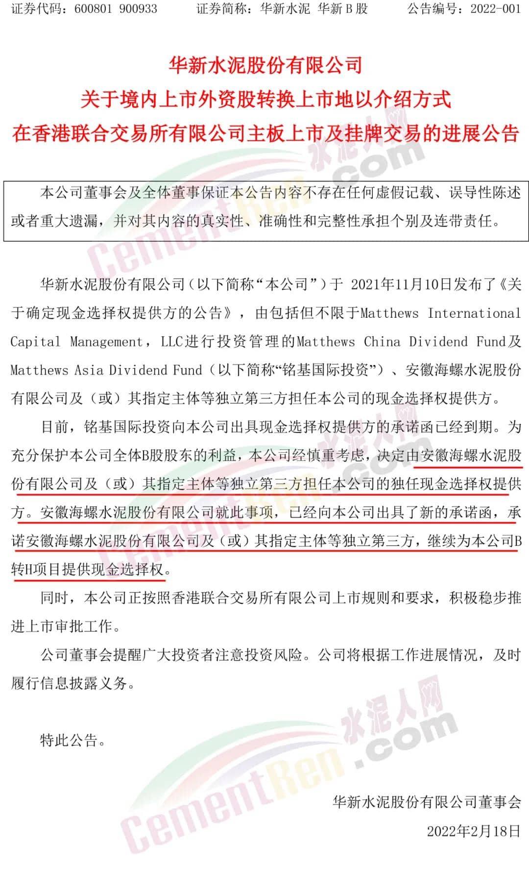 2月17日晚間,華新水泥發(fā)布公告,稱公司于 2021年11月10日發(fā)布了《關(guān)于確定現(xiàn)金選擇權(quán)提供方的公告》,由包括但不限于Matthews International Capital Management , LLC進行投資管理的Matthews China Dividend Fund及Matthews Asia Dividend Fund (“銘基國際投資”)、安徽海螺水泥股份有限公司及(或)其指定主體等獨立第三方擔任公司的現(xiàn)金選擇權(quán)提供方。