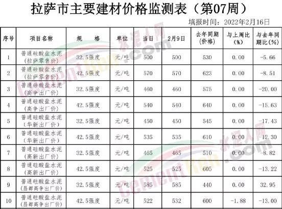 日前,西藏自治區(qū)發(fā)改委價格監(jiān)測中心發(fā)布了2022年第7周(2月10日至2月16日)拉薩市場主要建材價格周報。