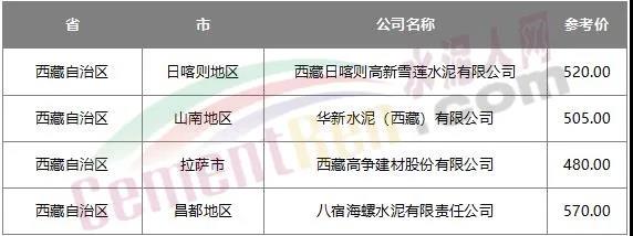 據(jù)水泥人網(wǎng)信息中心數(shù)據(jù),近日西藏自治區(qū)主要品牌水泥報價在480~570元/噸之間。