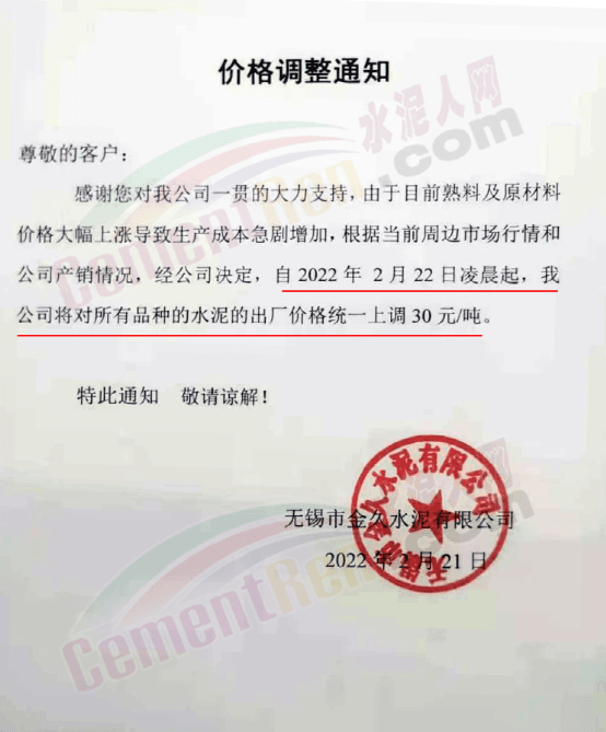 日前 ,無錫市金久水泥有限公司通知,由于目前熟料原材料價格大幅上漲導致生產成本急劇增加,根據(jù)當前周邊市場行情和公司產銷情況,經公司決定自2月22日凌晨起,公司將對所有品種的水泥出廠價統(tǒng)一上調30元/噸。