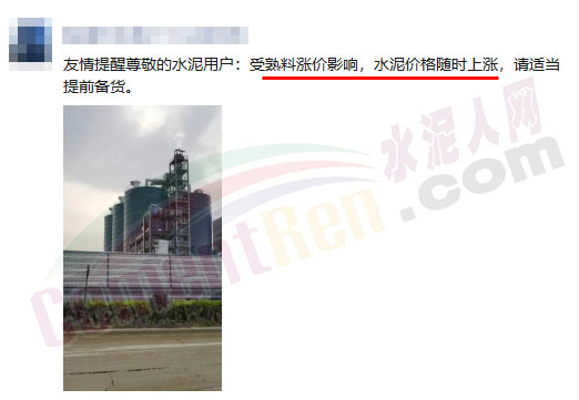 日前,長三角區(qū)域一貿(mào)易商發(fā)消息提醒用戶,受熟料漲價(jià)影響,水泥價(jià)格隨時(shí)上漲,請適當(dāng)提前備貨。