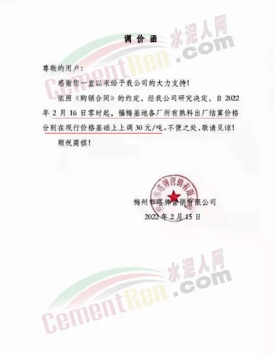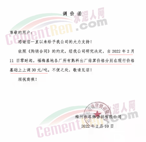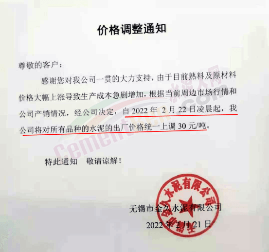 金久水泥漲價(jià)通知