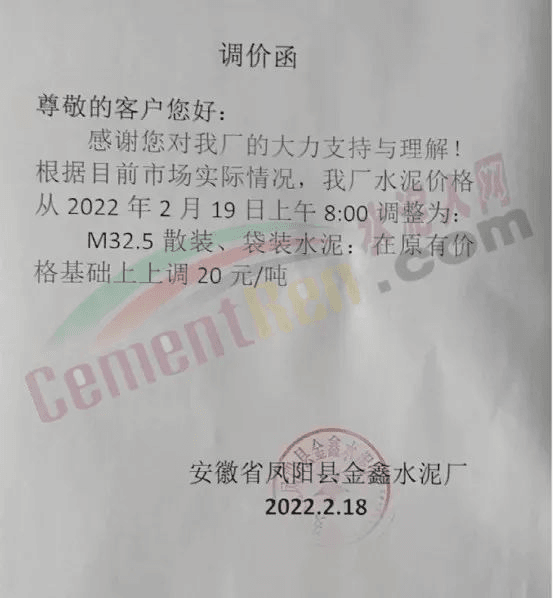金鑫水泥廠漲價(jià)通知