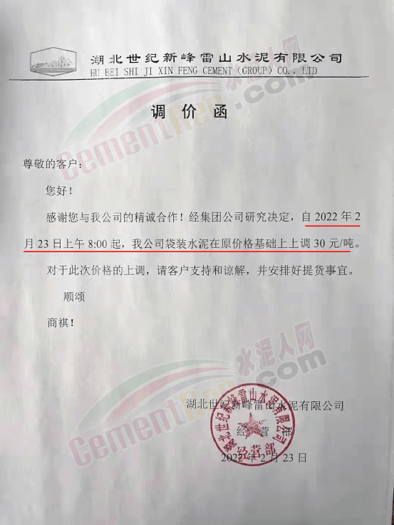 湖北世紀(jì)新峰雷山水泥有限公司通知,2月23日上午8時(shí)起,公司袋裝水泥在原價(jià)基礎(chǔ)上上調(diào)30元/噸。