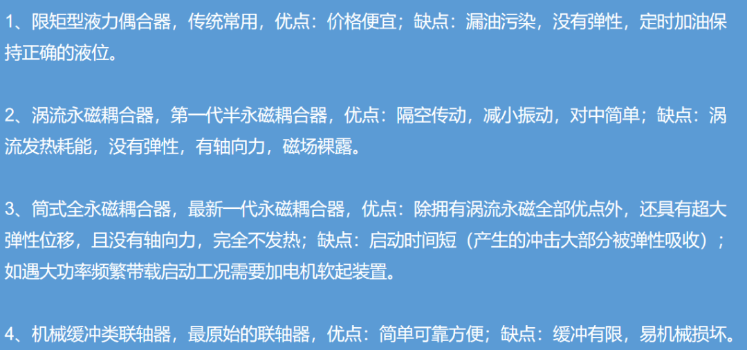 其中,耦合器作為水泥行業(yè)原料破碎、輸送、預(yù)熱、煅燒、熟料輸送、冷卻等生產(chǎn)進(jìn)程中的關(guān)鍵設(shè)備,其性能對于提高設(shè)備運(yùn)行的可靠性、減少維護(hù)費(fèi)用、節(jié)能降耗等具有重要的意義。目前市場中常見的緩沖類耦合器有限矩型液力耦合器、渦流永磁耦合器、筒式全永磁耦合器、機(jī)械緩沖類聯(lián)軸器等,各類耦合器的主要優(yōu)缺點(diǎn)如下: