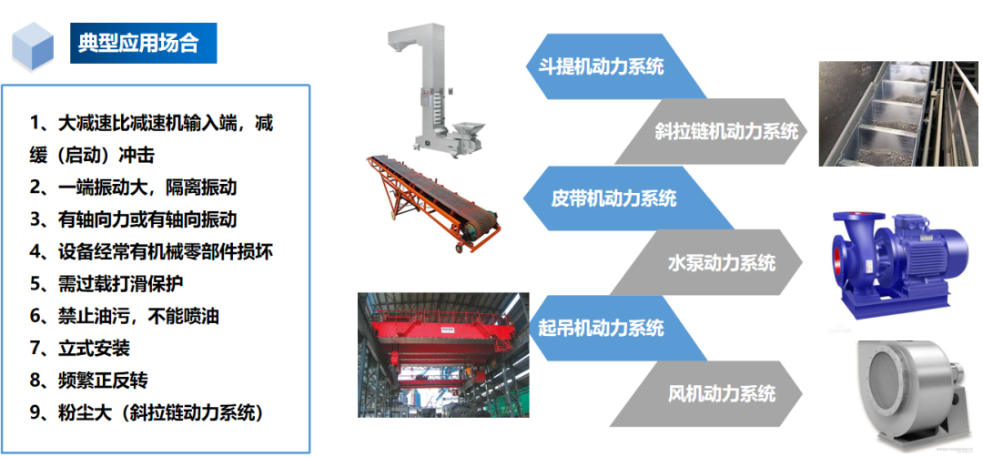 以江蘇磁谷科技股份有限公司(以下簡稱“江蘇磁谷”)的筒式全永磁耦合器為例,目前其在海螺水泥、西南水泥、中材水泥、天山水泥、金隅冀東水泥、華新水泥、紅獅水泥等多家大型水泥企業(yè)的斜拉鏈機(jī)、提升機(jī)、皮帶機(jī)、輥壓機(jī)、刮板機(jī)、堆取料機(jī)、原料磨選粉機(jī)、蓖冷機(jī)、渣漿機(jī)、破碎機(jī)、風(fēng)機(jī)、水泵、混料機(jī)等多個(gè)水泥生產(chǎn)設(shè)備上都有應(yīng)用,典型應(yīng)用場合主要集中在以下幾個(gè)方面: