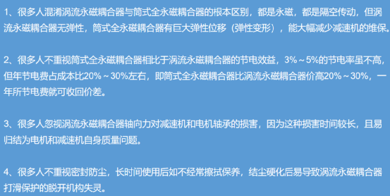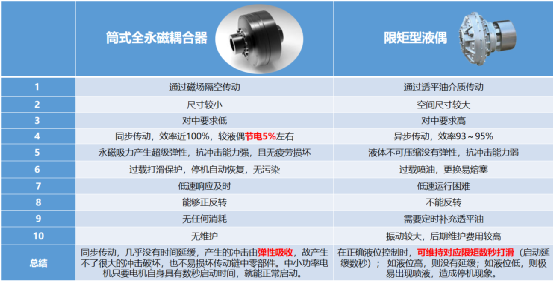 此外,為讓廣大水泥用戶更全面的了解永磁耦合器,江蘇磁谷特將市場上主流的永磁耦合器的選擇誤區(qū)以及筒式全永磁耦合器和渦流永磁耦合器、限矩型液耦的綜合性能對比匯總?cè)缦拢?/span>
