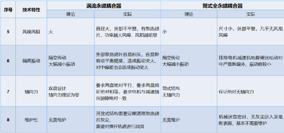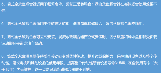 可以看出,筒式全永磁耦合器為新一代永磁耦合器,自身使用壽命20年,采用磁懸浮非接觸式磁場傳動(dòng),隔振降噪;此外全封閉不漏磁,更安全環(huán)保,適宜粉塵高溫等惡劣環(huán)境;傳遞效率接近100%,無滑差、不丟轉(zhuǎn)、無散熱片、傳遞效率更高,相比渦流永磁耦合器節(jié)能3~5%;筒式結(jié)構(gòu)、結(jié)構(gòu)簡單、輕便,環(huán)繞軸傳遞力矩、無軸向力、不會(huì)因永磁盤和導(dǎo)體盤相吸受負(fù)載波動(dòng)影響而造成軸向竄動(dòng);安裝方便,允許毫米級(jí)對中誤差;擁有超級(jí)彈性位移,彈性位移(角)達(dá)7.5~15度(最高可達(dá)90度),能有效緩解沖擊載荷,將整個(gè)傳動(dòng)鏈都變成柔性傳動(dòng),提升過載保護(hù)力,保護(hù)軸系設(shè)備以及整個(gè)傳動(dòng)鏈,延長電機(jī)和其他設(shè)備的使用年限,提高整個(gè)傳動(dòng)鏈所有設(shè)備壽命3~5年,在全使用壽命(大于15年)內(nèi)無維護(hù),提高生產(chǎn)可靠性,降低因傳動(dòng)問題導(dǎo)致停產(chǎn)的風(fēng)險(xiǎn),大大提高生產(chǎn)效率機(jī)場可靠性,節(jié)約生產(chǎn)成本。