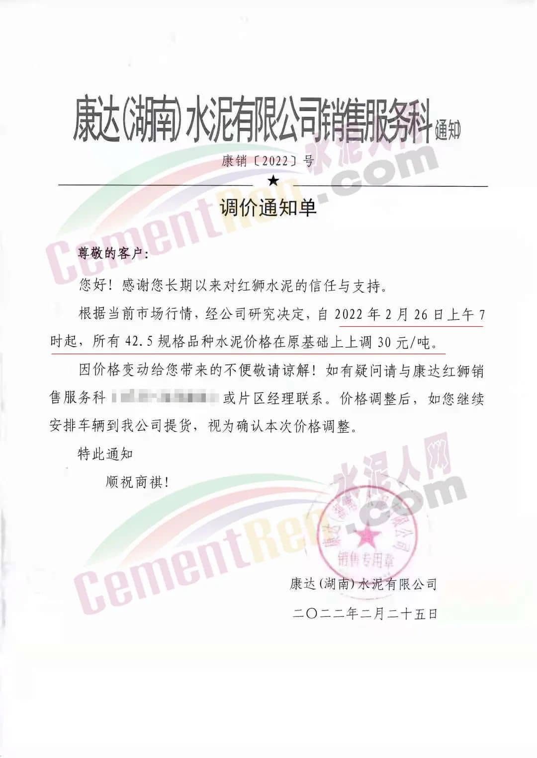 水泥人網(wǎng)通訊員消息,日前,紅獅水泥旗下康達(dá)(湖南)水泥有限公司銷售服務(wù)科通知,根據(jù)當(dāng)前市場(chǎng)行情 ,經(jīng)公司研究決定自2月26日上午7時(shí)起,所有42.5水泥在原基礎(chǔ)上上調(diào)30元/噸。