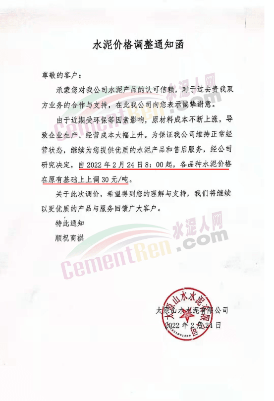 太原山水水泥有限公司通知由于近期受環(huán)保等因素影響,原材料成本不斷上漲,導(dǎo)致企業(yè)生產(chǎn)、經(jīng)營(yíng)成本大幅上升,為保證公司正常經(jīng)營(yíng),經(jīng)公司研究決定,自2月24日 8時(shí)起,各品種水泥價(jià)格在原有基礎(chǔ)上上調(diào)30元/噸。