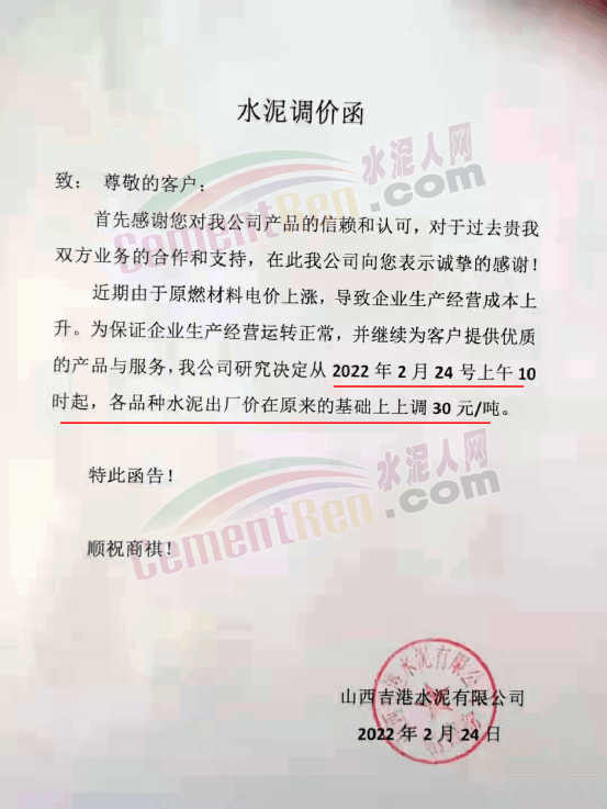 山西吉港水泥有限公司通知,由于原燃材料電價(jià)上漲,導(dǎo)致企業(yè)生產(chǎn)經(jīng)營(yíng)成本上升,為保證企業(yè)生產(chǎn)經(jīng)營(yíng)運(yùn)轉(zhuǎn)正常,經(jīng)公司研究決定從2月24日上午10時(shí)起,各品種水泥出廠價(jià)在原基礎(chǔ)上上調(diào)30元/噸。