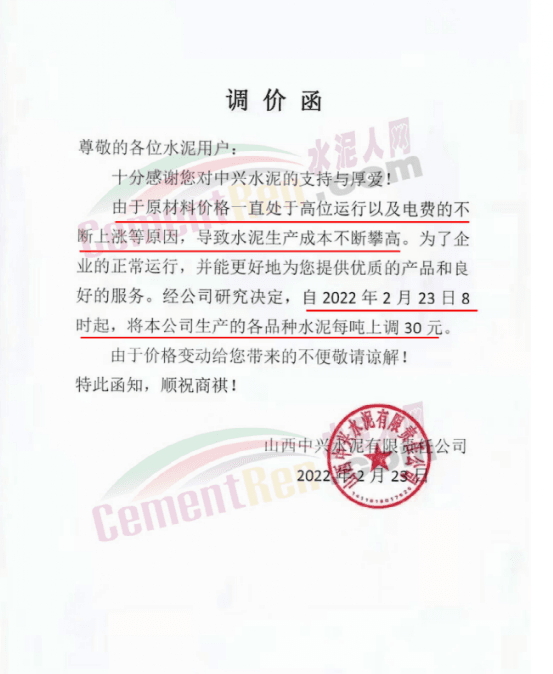 山西中興水泥有限公司通知,由于原材料價(jià)格一直處于高位運(yùn)行以及電費(fèi)的不斷上漲等原因,導(dǎo)致水泥生產(chǎn)成本不斷攀高。為了企業(yè)的正常運(yùn)行,經(jīng)公司研究決定,自2月23日8時(shí)起,將公司生產(chǎn)的各品種水泥上調(diào)30元/噸。