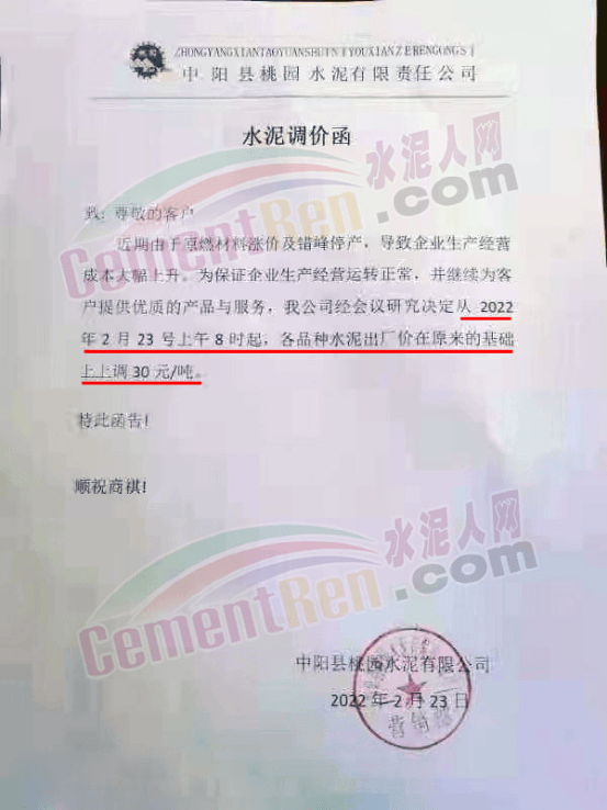 中陽(yáng)縣桃園水泥有限公司通知,由于原燃材料漲價(jià)及錯(cuò)峰停產(chǎn),導(dǎo)致企業(yè)生產(chǎn)經(jīng)營(yíng)成本大幅上升,為保證企業(yè)生產(chǎn)經(jīng)營(yíng)運(yùn)轉(zhuǎn)正常,經(jīng)研究決定從2月23日上午8時(shí)起,各品種水泥出廠價(jià)在原基礎(chǔ)上上調(diào)30元/噸。