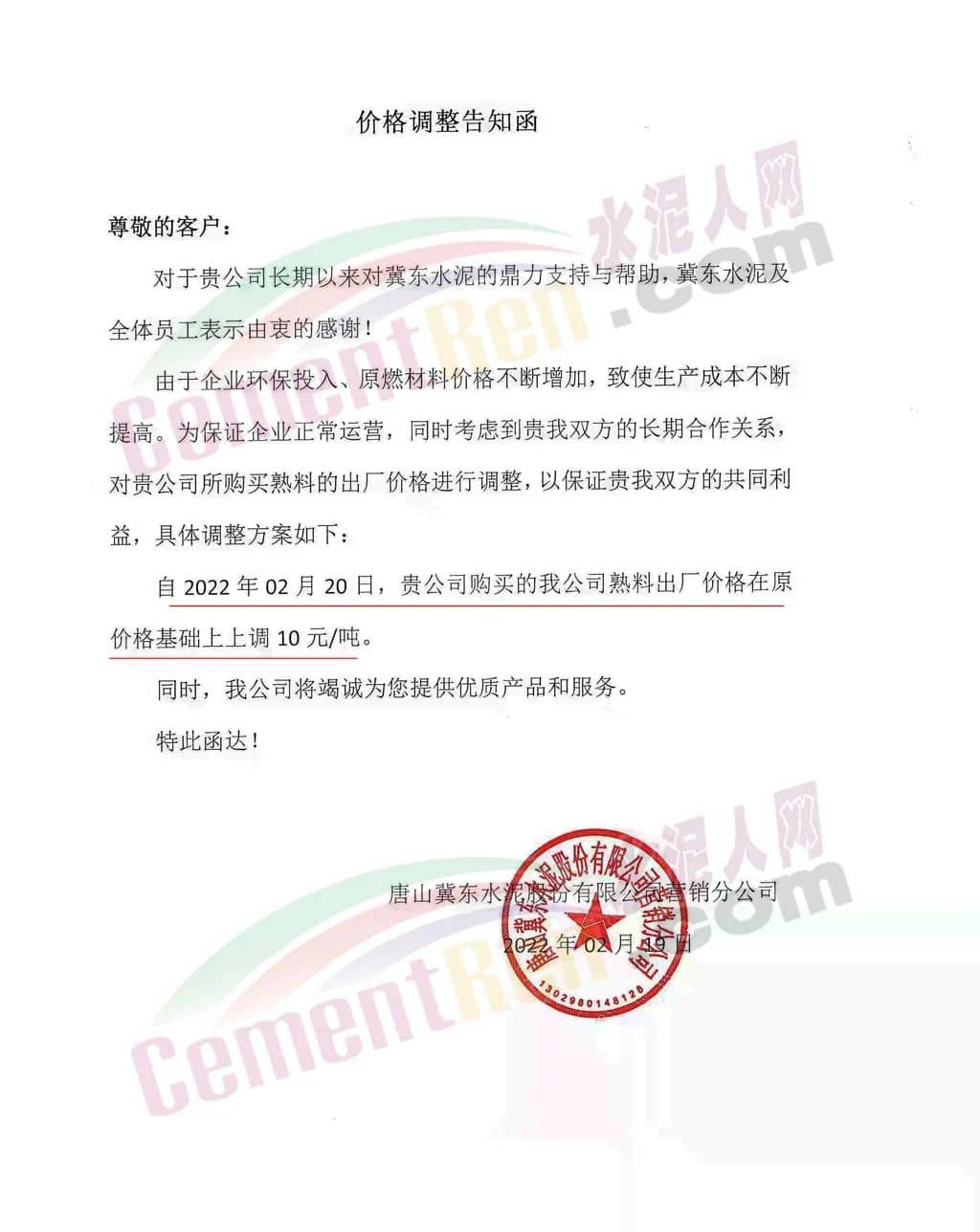 另?yè)?jù)水泥人網(wǎng)信息中心消息,近期河北省內(nèi)多家企業(yè)通知上調(diào)熟料價(jià)格。唐山冀東水泥股份有限公司營(yíng)銷分公司通知由于企業(yè)環(huán)保投入、原燃材料價(jià)格不斷增加,致使生產(chǎn)成本不斷提高。為保證企業(yè)正常運(yùn)營(yíng),自2月20日起,熟料出廠價(jià)在原基礎(chǔ)上上調(diào)10元/噸。