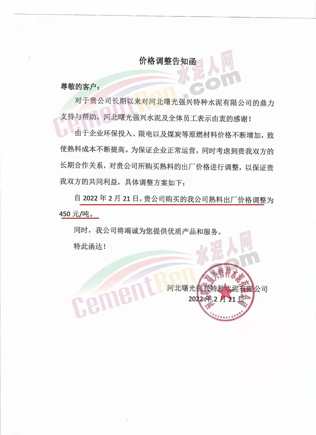 灤縣磐石水泥有限公司及河北曙光強(qiáng)興特種水泥有限公司通知,由于環(huán)保投入、限電以及煤炭等原燃材料價(jià)格不斷增加,致使熟料成本不斷提高。為保證企業(yè)正常運(yùn)營(yíng),自2月21日起公司熟料出廠價(jià)格調(diào)整為450元/噸。