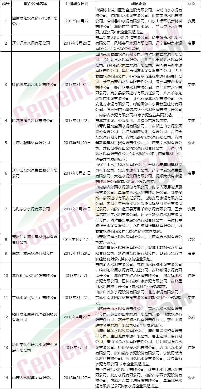據(jù)查詢,自2017年以來(lái)國(guó)內(nèi)行業(yè)成立的水泥區(qū)域聯(lián)合公司共14家。