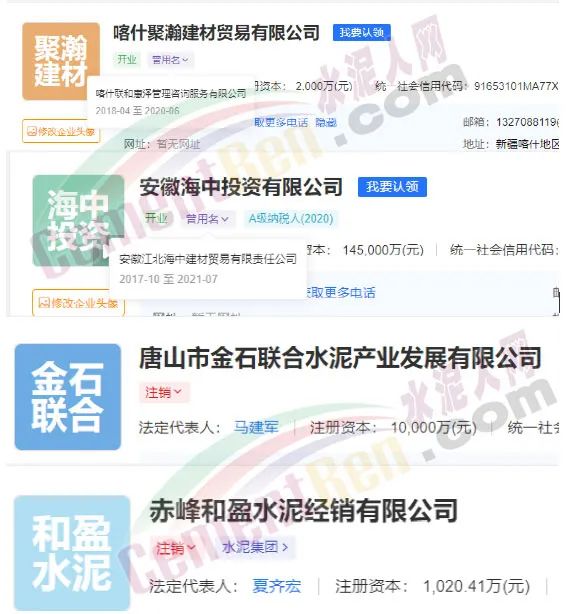 據(jù)愛(ài)企查數(shù)據(jù)顯示,截止目前上述聯(lián)合水泥公司多數(shù)已經(jīng)進(jìn)行了變更。涉及企業(yè)名稱、經(jīng)營(yíng)范圍變更、人員變更、出資比例變更、市場(chǎng)主體類(lèi)型變更以及股權(quán)變更等多個(gè)項(xiàng)目。其中,喀什聯(lián)和惠澤管理咨詢服務(wù)有限公司、安徽江北海中建材貿(mào)易有限責(zé)任公司兩家企業(yè)已更名;唐山金石聯(lián)合水泥產(chǎn)業(yè)發(fā)展有限公司、赤峰和盈水泥經(jīng)銷(xiāo)有限公司已為“注銷(xiāo)”狀態(tài)。