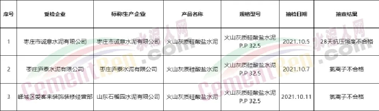 山東省棗莊市市場監(jiān)督管理局公布水泥質(zhì)量抽查結(jié)果顯示3批次出現(xiàn)不合格。不合格項目為28天抗壓強度和氯離子,不合格品標稱企業(yè)為棗莊市誠意水泥有限公司、棗莊廬泰水泥有限公司、山東石榴園水泥有限公司。
