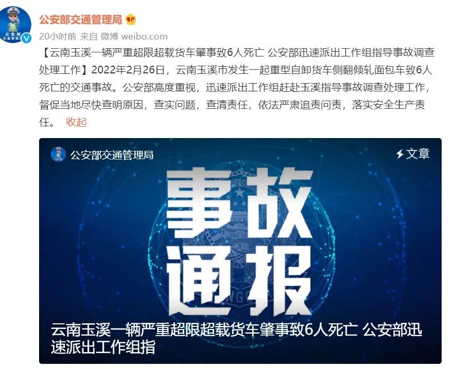 據(jù)公安部交通管理局微博消息,2022年2月26日,云南玉溪市發(fā)生一起重型自卸貨車側(cè)翻傾軋面包車致6人死亡的交通事故。公安部高度重視,迅速派出工作組趕赴玉溪指導(dǎo)事故調(diào)查處理工作,督促當(dāng)?shù)乇M快查明原因,查實(shí)問題,查清責(zé)任,依法嚴(yán)肅追責(zé)問責(zé),落實(shí)安全生產(chǎn)責(zé)任。
