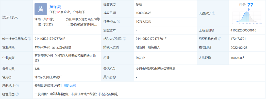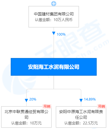 安陽中聯(lián)水泥有限公司成立于2006年8月8日,法定代表人為劉宗虎,注冊(cè)資本為6億元,經(jīng)營(yíng)范圍含發(fā)電、輸電、供電業(yè)務(wù)等。目前,該公司由安陽中海新材料有限公司、河南中聯(lián)同力材料有限公司共同持股,持股比例均為50%。