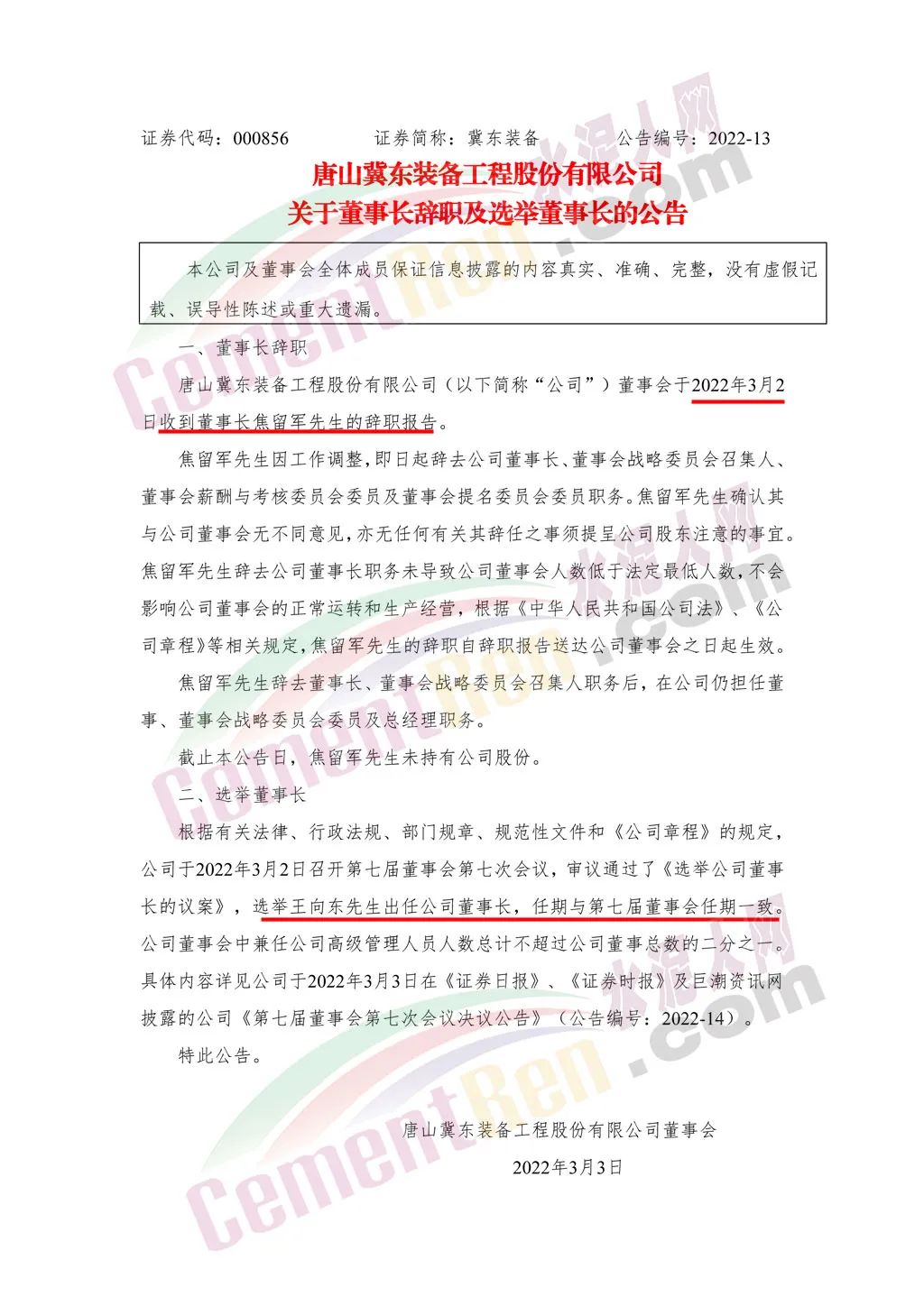 冀東裝備3月2日晚間公告,公司董事會(huì)于2022年3月2日收到董事長(zhǎng)焦留軍的辭職報(bào)告。焦留軍因工作調(diào)整,即日起辭去公司董事長(zhǎng)、董事會(huì)戰(zhàn)略委員會(huì)召集人、董事會(huì)薪酬與考核委員會(huì)委員及董事會(huì)提名委員會(huì)委員職務(wù)。焦留軍辭去董事長(zhǎng)、董事會(huì)戰(zhàn)略委員會(huì)召集人職務(wù)后,在公司仍擔(dān)任董事、董事會(huì)戰(zhàn)略委員會(huì)委員及總經(jīng)理職務(wù)。
