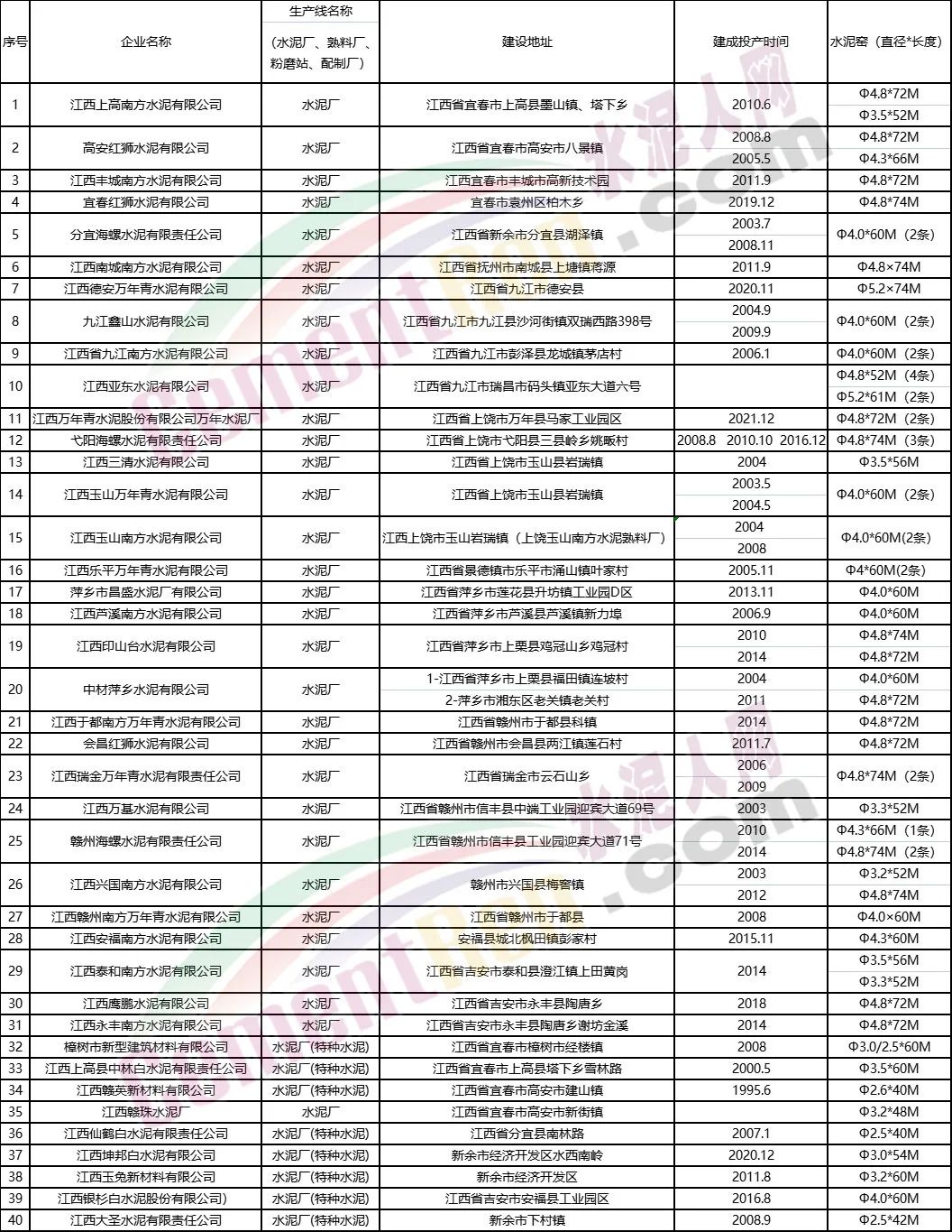江西省水泥熟料生產(chǎn)線情況表