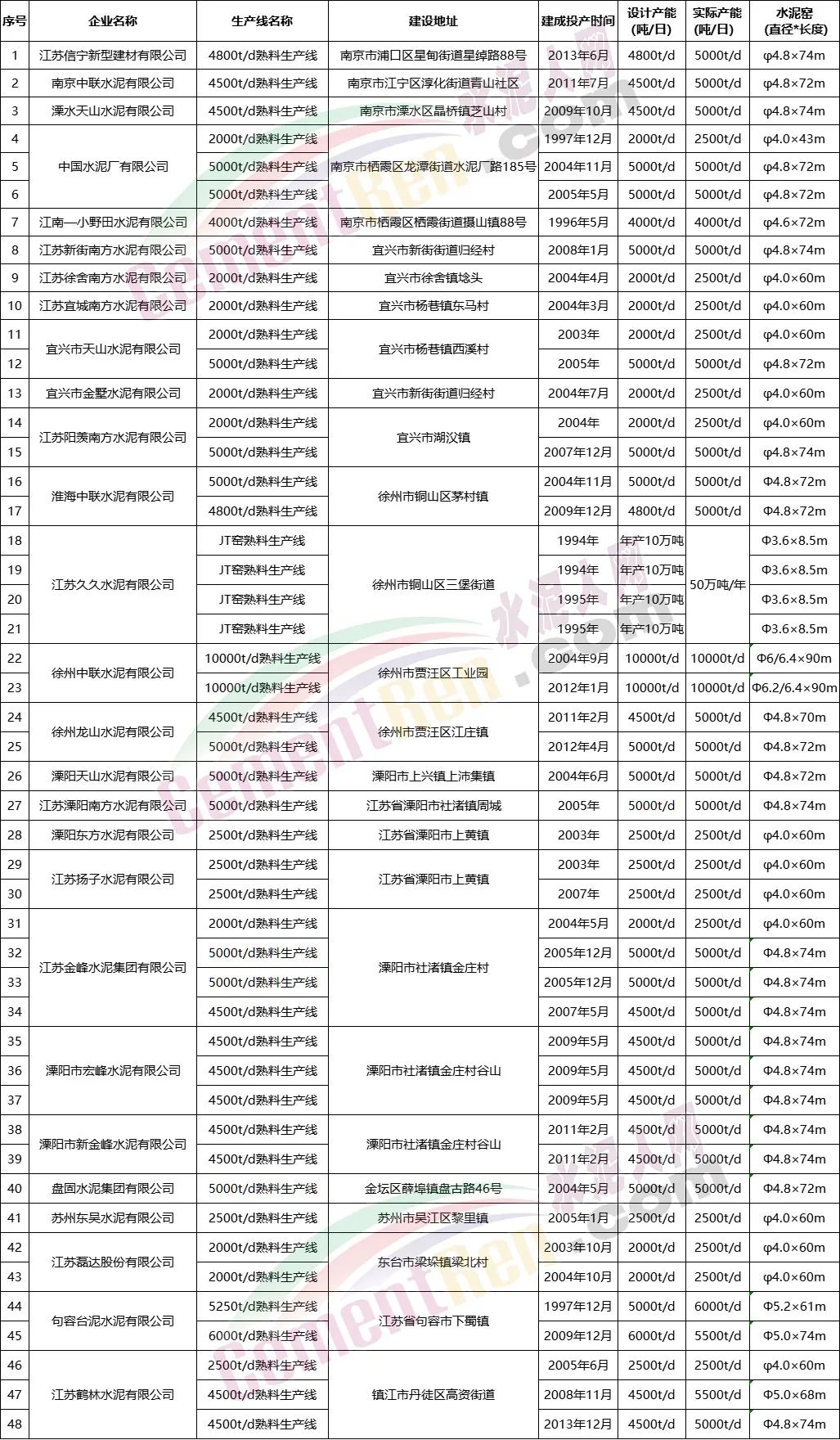 江蘇省水泥熟料生產(chǎn)線清單
